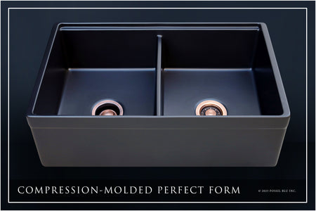 Luxury 33" x 20" compression-molded SOLID fireclay workstation apron-front kitchen sink in MATTE BLACK. 50/50 double bowl, modern design with 1/2" radius interior corners, straight sidewalls, belted front apron, 1" material thickness, and glossy glaze. Topside accessories include a roll-out drying mat and slotted bamboo cutting board. Elegant polished rose gold "linear" (pattern), basket strainer-drain, and disposal flange basin accessories finish out the package.