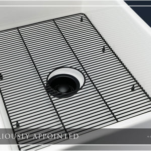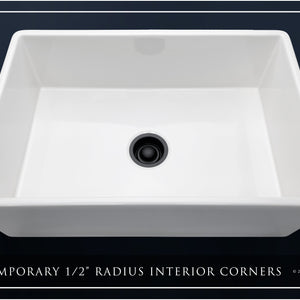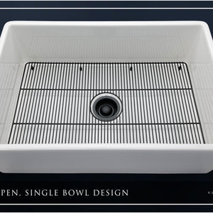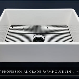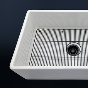 Luxury 30" x 20" compression-molded SOLID fireclay farmhouse kitchen sink. Single bowl, modern design with 1/2" radius interior corners, straight sidewalls, flat front apron, 7/8" material thickness, and glossy glaze. Elegant matte black "linear" (pattern) sink grid, basket strainer-drain, and disposal flange included