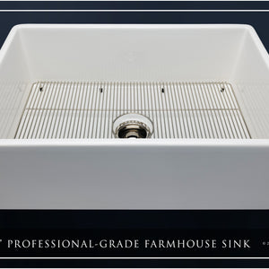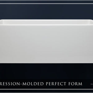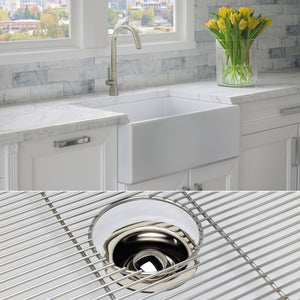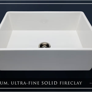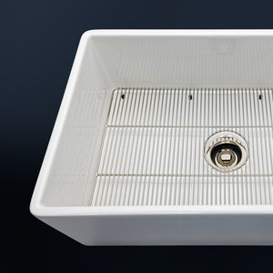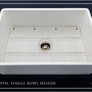 Luxury 30" x 20" compression-molded SOLID fireclay farmhouse kitchen sink. Single bowl, modern design with 1/2" radius interior corners, straight sidewalls, flat front apron, 7/8" material thickness, and glossy glaze. Elegant polished nickel "linear" (pattern) sink grid, basket strainer-drain, and disposal flange included