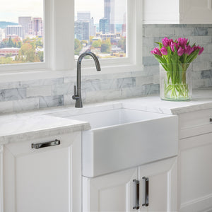 Fossil Blu fireclay sinks are designed with tighter corners and straighter sidewalls for a definitively up-to-date appearance. Combine this with luxurious accessories and a bold rectangular front apron, and your sink becomes the centerpiece of your remodeled kitchen.