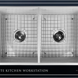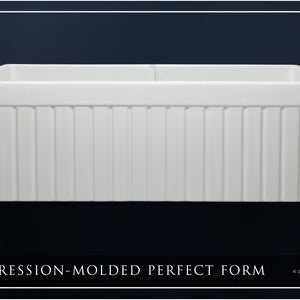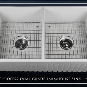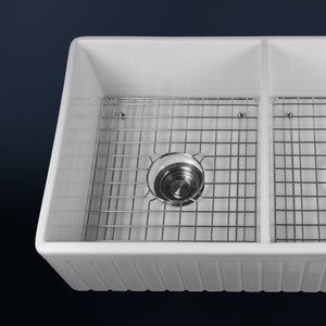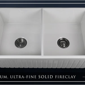 Luxury 33" x 20" compression-molded SOLID fireclay farmhouse kitchen sink. 50/50 Double bowl, modern design with 1/2" radius interior corners, straight sidewalls, fluted front apron, 7/8" material thickness, and glossy glaze. Classic stainless steel "checkboard" (pattern) sink grids, basket strainer-drains, and disposal flanges included