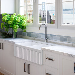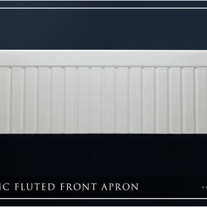 Turn-of-the-century farm sinks nearly always included a design on the front apron. The most common of which was a vertically grooved (fluted) imprint. Today, as the “Modern Farmhouse” trend has taken storm, the majority of new farmhouse sinks sold feature a simple, flat-front, modern apron. However, for those seeking something more, Fossil Blu’s 1.5” beaded shaker style of this fluted-front sink offers a blend of antique styling with a contemporary appeal. The design is crisp, yet features soft edges and a supple appearance to the front, characteristic of the natural fireclay material underneath. At 1-1/8” thickness, the apron presents as a bold, sophisticated sink and, much like shaker cabinet fronts, is a good fit in a variety of classic stylistic themes. The left and right sides of the sink are fully finished, allowing for any install depth. We generally recommend 1-1/2” to 2” of the sink to be exposed on the left and right sides.