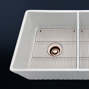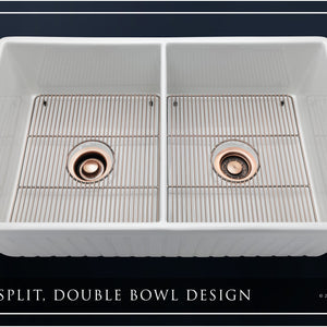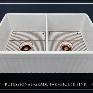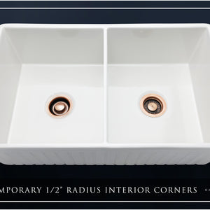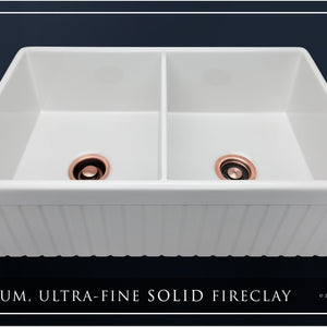 Luxury 33" x 20" compression-molded SOLID fireclay farmhouse kitchen sink. 50/50 Double bowl, modern design with 1/2" radius interior corners, straight sidewalls, fluted front apron, 7/8" material thickness, and glossy glaze. Elegant antique copper "linear" (pattern) sink grids, basket strainer-drains, and disposal flanges included