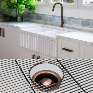 FSW1006AC LUXURY 33-INCH SOLID FIRECLAY FARMHOUSE SINK IN WHITE, ANTIQUE COPPER ACCS, FLUTED FRONT