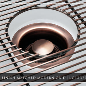 Included with this sink are three accessories: Two (2) modern DESIGN-PRO sink grids, one (1) basket strainer drain, and one (1) garbage-disposal flange. For material strength, these accessories are made from 304 stainless steel, and finished in Antique Copper. To apply this finish, we first plate the stainless steel with copper before then applying a veil of black powder coating. After light brushing, the copper finish displays an antiqued look, which leans more toward dark tones than brighter copper tones. This is intentionally done so as to compliment both copper and bronze tones. All Fossil Blu sink accessories carry a limited one-year warranty.