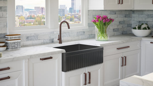 Turn-of-the-century farm sinks nearly always included a design on the front apron. The most common of which was a vertically grooved (fluted) imprint. Today, as the “Modern Farmhouse” trend has taken storm, the majority of new farmhouse sinks sold feature a simple, flat-front, modern apron. However, for those seeking something more, Fossil Blu’s 1.5” beaded shaker style of this fluted-front sink offers a blend of antique styling with a contemporary appeal. The design is crisp, yet features soft edges and a supple appearance to the front, characteristic of the natural fireclay material underneath. At 1-1/8” thickness, the apron presents as a bold, sophisticated sink and, much like shaker cabinet fronts, is a good fit in a variety of classic stylistic themes. The left and right sides of the sink are fully finished, allowing for any install depth. We generally recommend 1-1/2” to 2” of the sink to be exposed on the left and right sides.