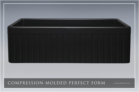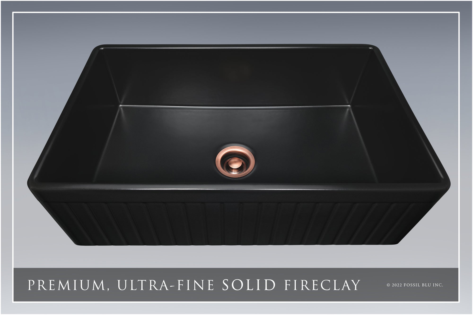 Luxury 33" x 20" compression-molded SOLID fireclay farmhouse kitchen sink in MATTE BLACK. Single bowl, modern design with 1/2" radius interior corners, straight sidewalls, fluted front apron, 7/8" material thickness, and matte glaze. Elegant antique copper "linear" (pattern) sink grid, basket strainer-drain, and disposal flange included