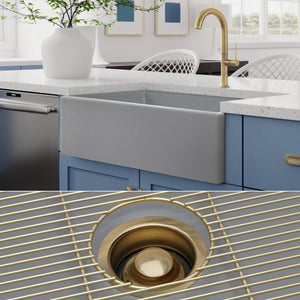 Luxury 33" x 20" compression-molded SOLID fireclay farmhouse kitchen sink in MATTE GRAY. Single bowl, modern design with 1/2" radius interior corners, straight sidewalls, flat front apron, 7/8" material thickness, and matte glaze. Elegant matte gold "linear" (pattern) sink grid, basket strainer-drain, and disposal flange included
