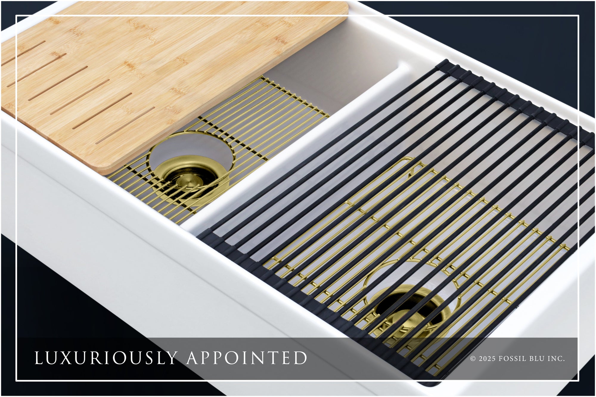Luxury 33" x 20" compression-molded SOLID fireclay workstation apron-front kitchen sink. 50/50 double bowl, modern design with 1/2" radius interior corners, straight sidewalls, belted front apron, 1" material thickness, and glossy glaze. Topside accessories include a roll-out drying mat and slotted bamboo cutting board.  Elegant matte gold "linear" (pattern), basket strainer-drain, and disposal flange basin accessories finish out the package.