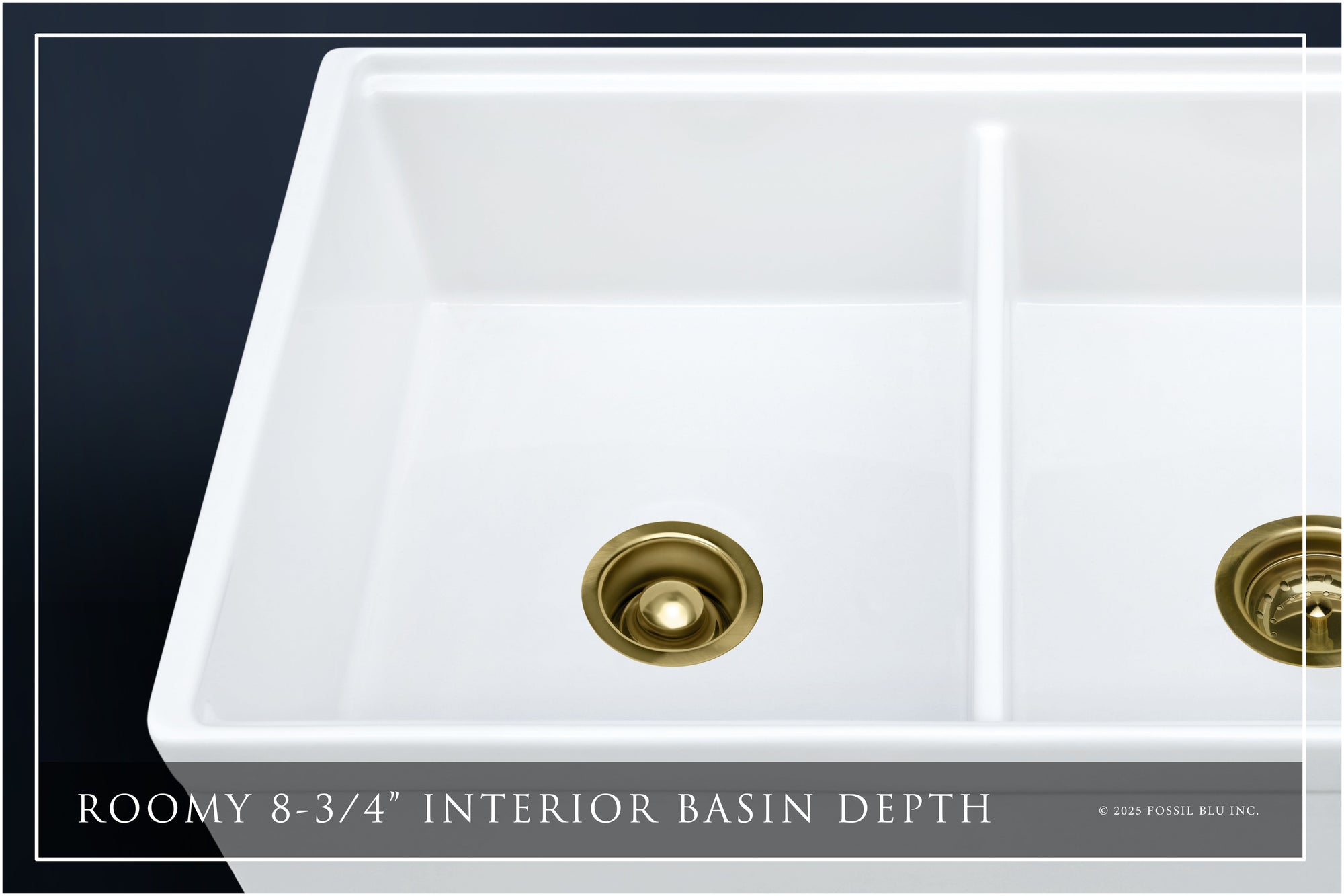 Over the last five years, Fossil Blu’s 33-inch-class fireclay sinks have grown in popularity to become the top selling sink size in our line. Large, functional, and beautiful, this sink not only makes a statement, but serves to benefit busy households. It can easily fit an entire 8-piece set of tableware after dinner is done, making this the choice of designers and homeowners alike. It is designed to fit atop 33” and 36” sink base cabinets, which are standard for medium-to-large kitchens, saving you time and money during installation. See specification sheet (below) for spec data and dimensional line art. As a natural product, minor variances in dimensions may occur. QA tolerances are held at +/- 2%.