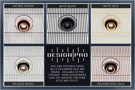 Available in six finishes, only Fossil Blu allows you to match your sink basin accessories to the hardware color motif of your kitchen. Choose from Antique Copper (pairs well with Oil Rubbed Bronze), Matte Black, Matte Gold (similar to Matte Brass or "Champagne Bronze"), Polished Nickel, Polished Rose Gold, or our classic Stainless Steel in a checkerboard pattern.