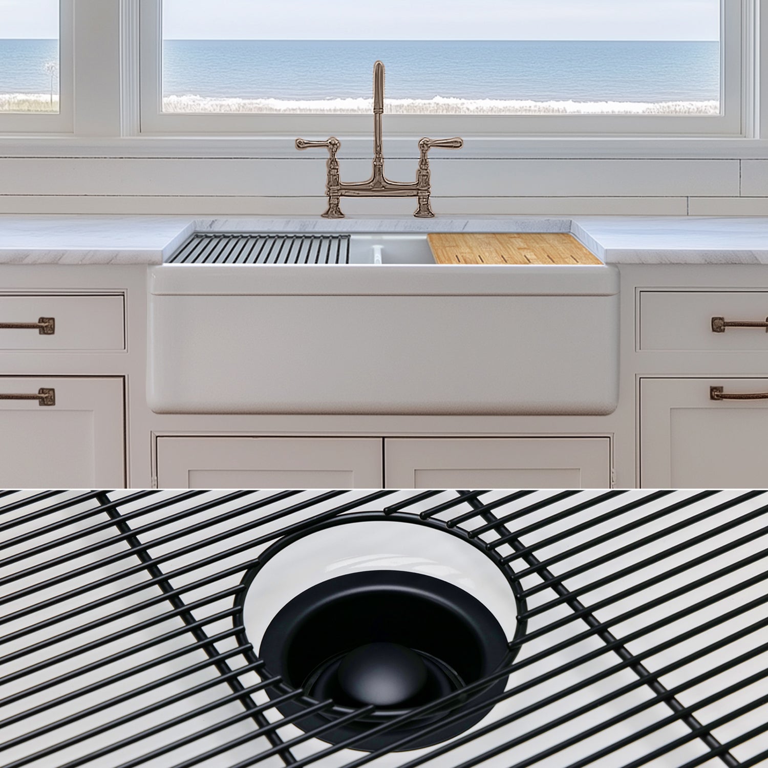 Included with this sink are five accessories: One (1) Bamboo cutting board, one (1) silicone dish drying rack, two (2) custom-fitted sink grids, one (1) basket strainer drain, and one (1) garbage-disposal flange.