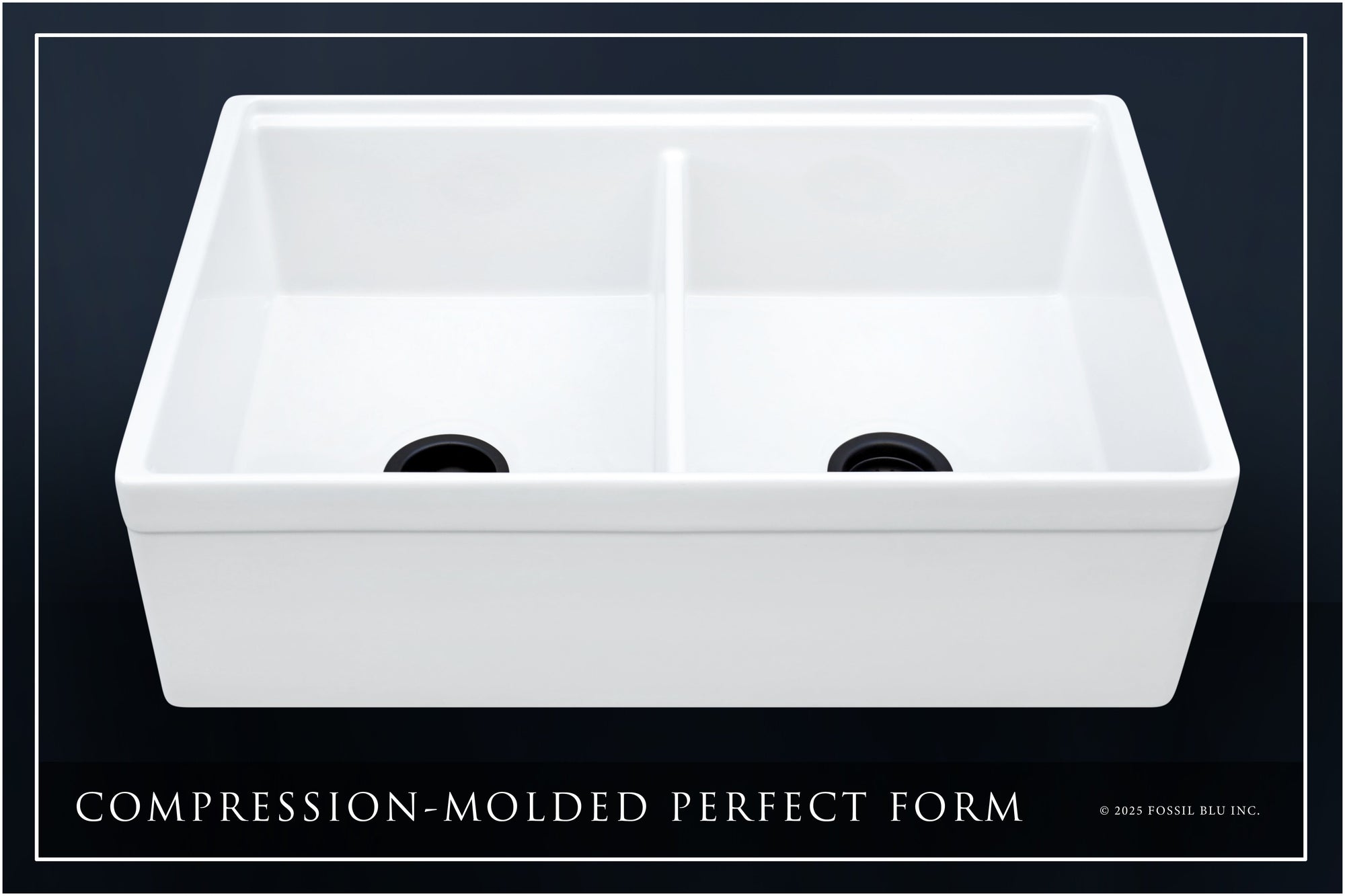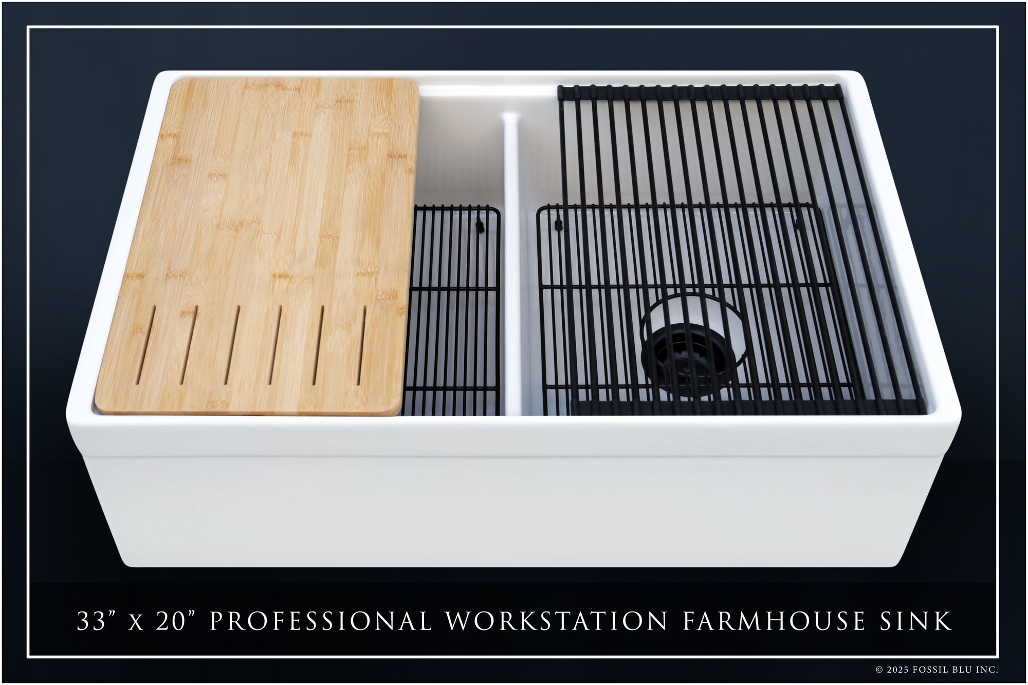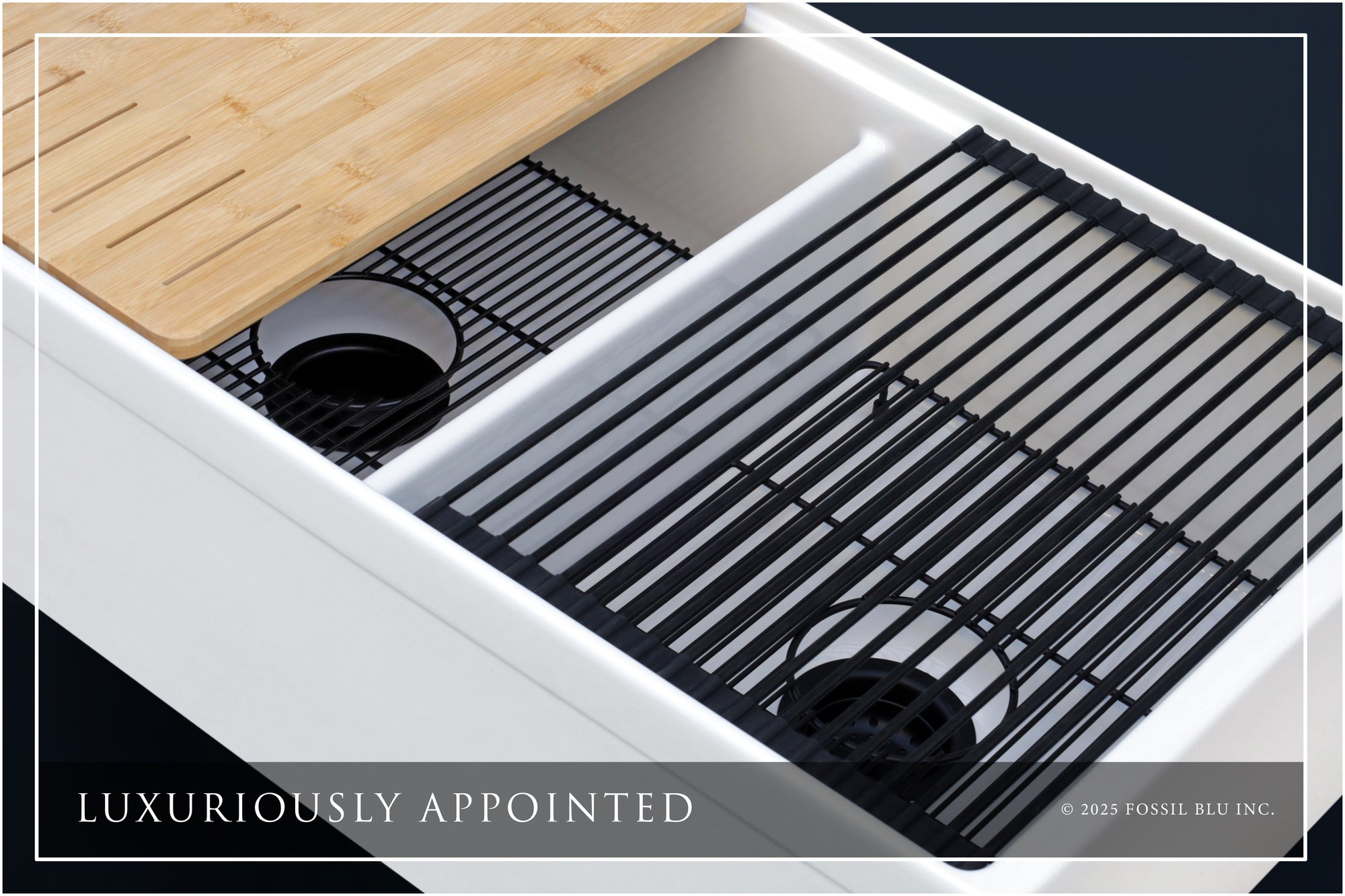 Luxury 33" x 20" compression-molded SOLID fireclay workstation apron-front kitchen sink. 50/50 double bowl, modern design with 1/2" radius interior corners, straight sidewalls, belted front apron, 1" material thickness, and glossy glaze. Topside accessories include a roll-out drying mat and slotted bamboo cutting board. Elegant matte black "linear" (pattern), basket strainer-drain, and disposal flange basin accessories finish out the package.