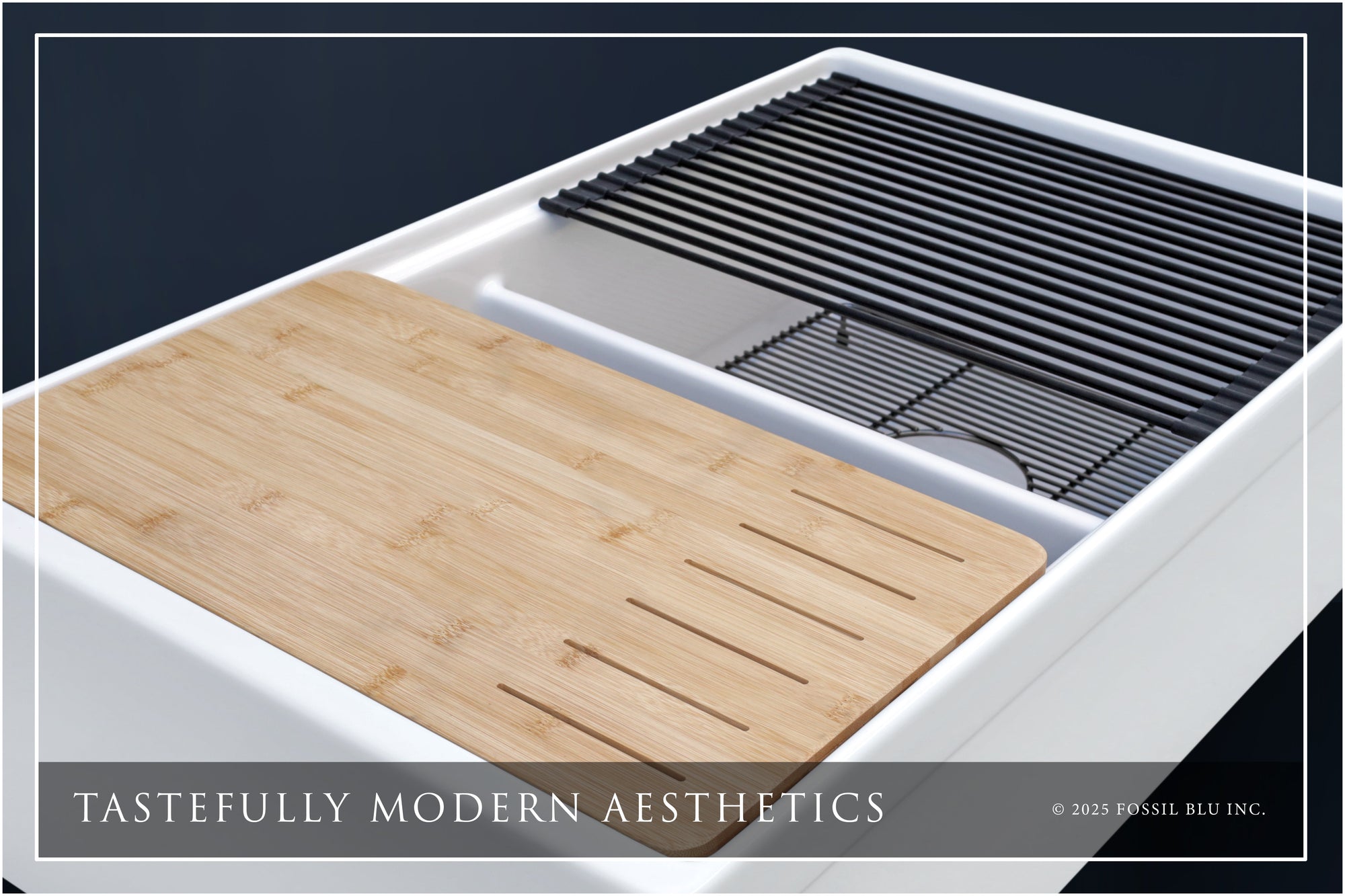 A kitchen can always use more utility, and Fossil Blu workstation sinks provide just that; additional workspace otherwise not afforded to the kitchen sink. Included are a bamboo cutting board and a drying rack, both easily added or removed depending on the moment's needs.