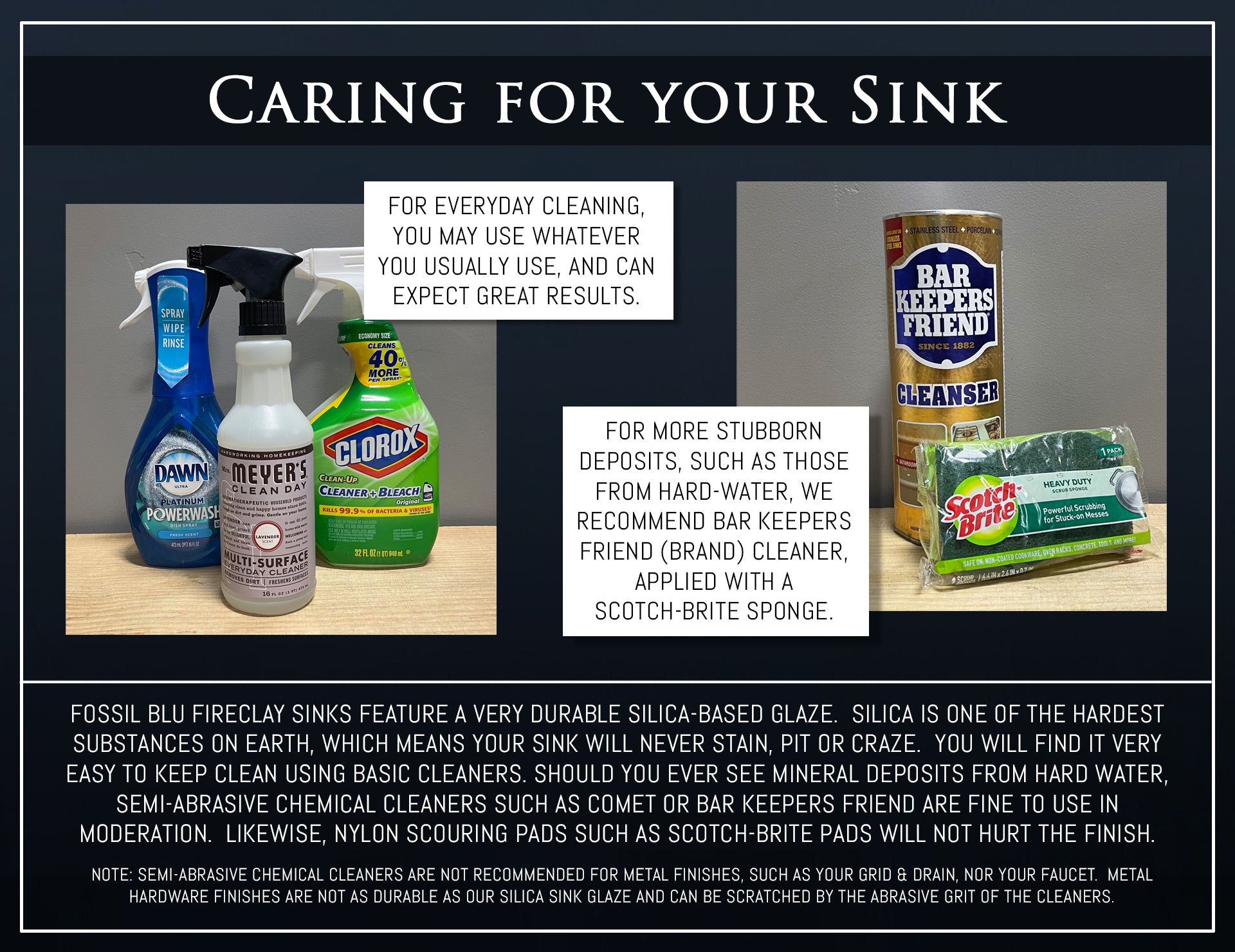 Of course, the best thing you could do to maintain your sink would be to dry it after every use, but we recognize this is unrealistic for busy households. Good news is that whatever daily soap and/or cleaner you normally use is the same cleaner you can keep right on using in your Fossil Blu sink. And should you ever see hard-water mineral buildups or other such deposits, semi-abrasive chemical cleaners such as Comet or Bar Keepers Friend are also fine to use in moderation. Nylon scouring pads such as Scotch-Brite pads and sponges are great options and will not hurt the finish.