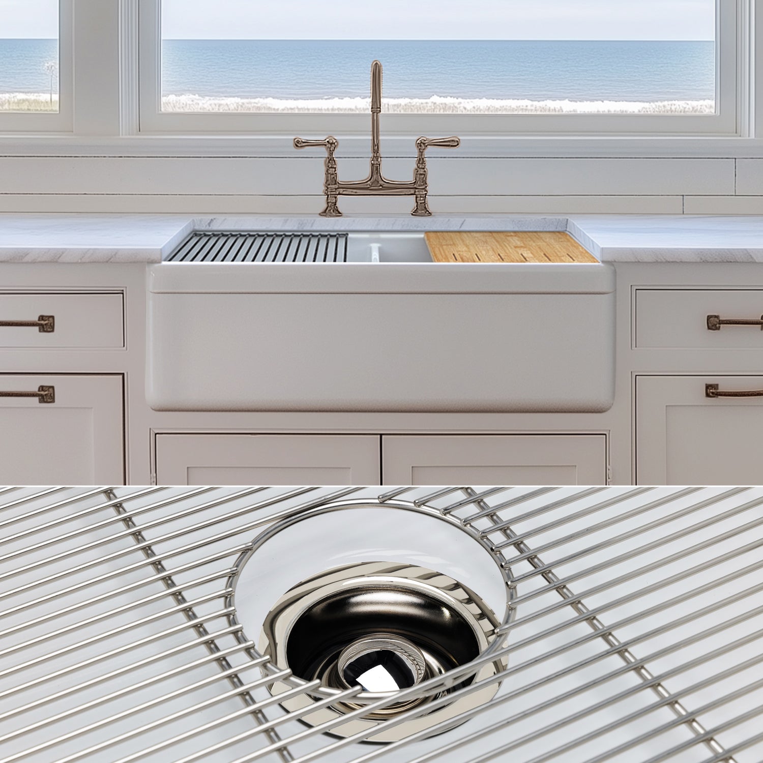 Included with this sink are five accessories: One (1) Bamboo cutting board, one (1) silicone dish drying rack, two (2) custom-fitted sink grids, one (1) basket strainer drain, and one (1) garbage-disposal flange.