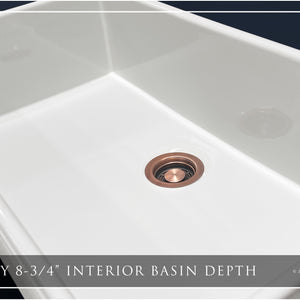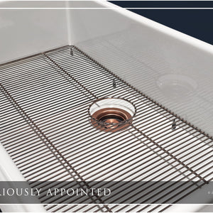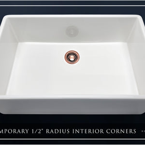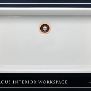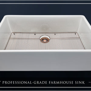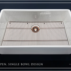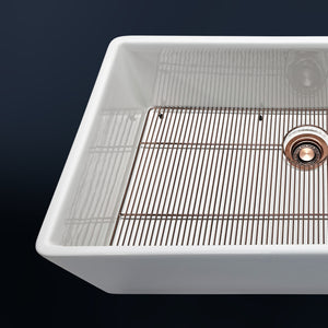 Luxury 36" x 20" compression-molded SOLID fireclay farmhouse kitchen sink. Single bowl, modern design with 1/2" radius interior corners, straight sidewalls, flat front apron, 7/8" material thickness, and glossy glaze. Elegant antique copper "linear" (pattern) sink grid, basket strainer-drain, and disposal flange included