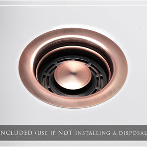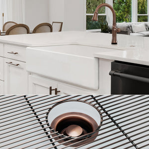 Included with this sink are three accessories: One (1) modern DESIGN-PRO sink grid, one (1) basket strainer drain, and one (1) garbage-disposal flange. For material strength, these accessories are made from 304 stainless steel, and finished in Antique Copper (pairs very well with bronze fixtures, including oil-rubbed bronze). To apply this finish, we first plate the stainless steel with copper before then applying a veil of black powder coating. After light brushing, the copper finish displays an antiqued look, which leans more toward dark tones than brighter copper tones. This is intentionally done so as to compliment both copper and bronze tones. All Fossil Blu sink accessories carry a limited one-year warranty.