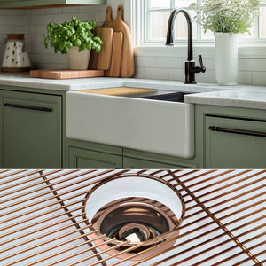 Available in six finishes, only Fossil Blu allows you to match your sink basin accessories to the hardware color motif of your kitchen. Choose from Antique Copper (pairs well with Oil Rubbed Bronze), Matte Black, Matte Gold (similar to Matte Brass or "Champagne Bronze"), Polished Nickel, Polished Rose Gold, or our classic Stainless Steel in a checkerboard pattern.
