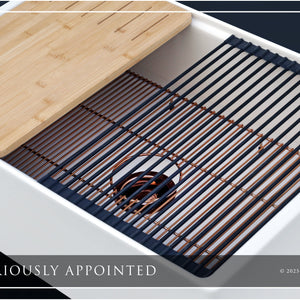 Luxury 30" x 20" compression-molded SOLID fireclay workstation apron-front kitchen sink. Single bowl, modern design with 1/2" radius interior corners, straight sidewalls, flat front apron, 1" material thickness, and glossy glaze. Topside accessories include a roll-out drying mat and slotted bamboo cutting board. Elegant polished rose gold "linear" (pattern), basket strainer-drain, and disposal flange basin accessories finish out the package.