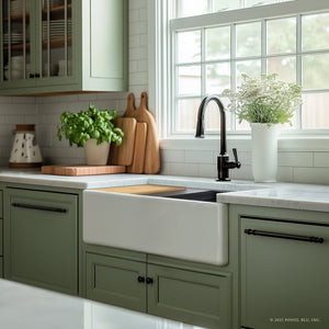 Our most popular choice for the sink apron, Fossil Blu’s flat-front fireclay farmhouse sinks provide a clean and classic look to updated kitchens. With no imprint, the rectangular shape is itself the design... a muted elegance, allowing for other kitchen elements to share the spotlight. Our flat-front fireclay sinks feature soft edges and a supple appearance to the front, characteristic of the natural fireclay material underneath. At 1” thickness, it presents as a contemporary sink and is therefore a neutral fit in a variety of kitchen themes. The left and right sides of the sink are fully finished, allowing for any install depth. We generally recommend 1-1/2” to 2” of the sink to be exposed on the left and right sides.