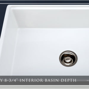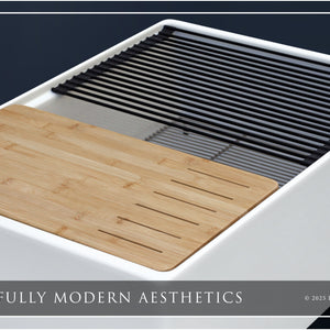 Luxury 33" x 20" compression-molded SOLID fireclay workstation apron-front kitchen sink. Single bowl, modern design with 1/2" radius interior corners, straight sidewalls, flat front apron, 1" material thickness, and glossy glaze. Topside accessories include a roll-out drying mat and slotted bamboo cutting board. Elegant polished nickel "linear" (pattern), basket strainer-drain, and disposal flange basin accessories finish out the package.
