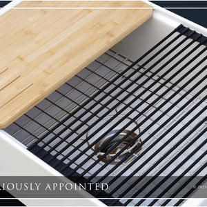 Included with this sink are five accessories: One (1) Bamboo cutting board, one (1) silicone dish drying rack, one (1) custom-fitted sink grid, one (1) basket strainer drain, and one (1) garbage-disposal flange.