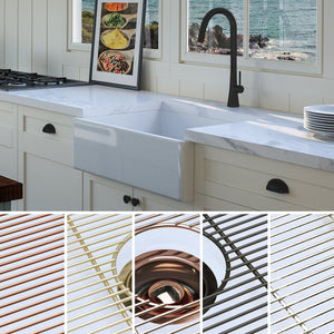 Available in six finishes, only Fossil Blu allows you to match your sink basin accessories to the hardware color motif of your kitchen. Choose from Antique Copper (pairs well with Oil Rubbed Bronze), Matte Black, Matte Gold (similar to Matte Brass or "Champagne Bronze"), Polished Nickel, Polished Rose Gold, or our classic Stainless Steel in a checkerboard pattern.