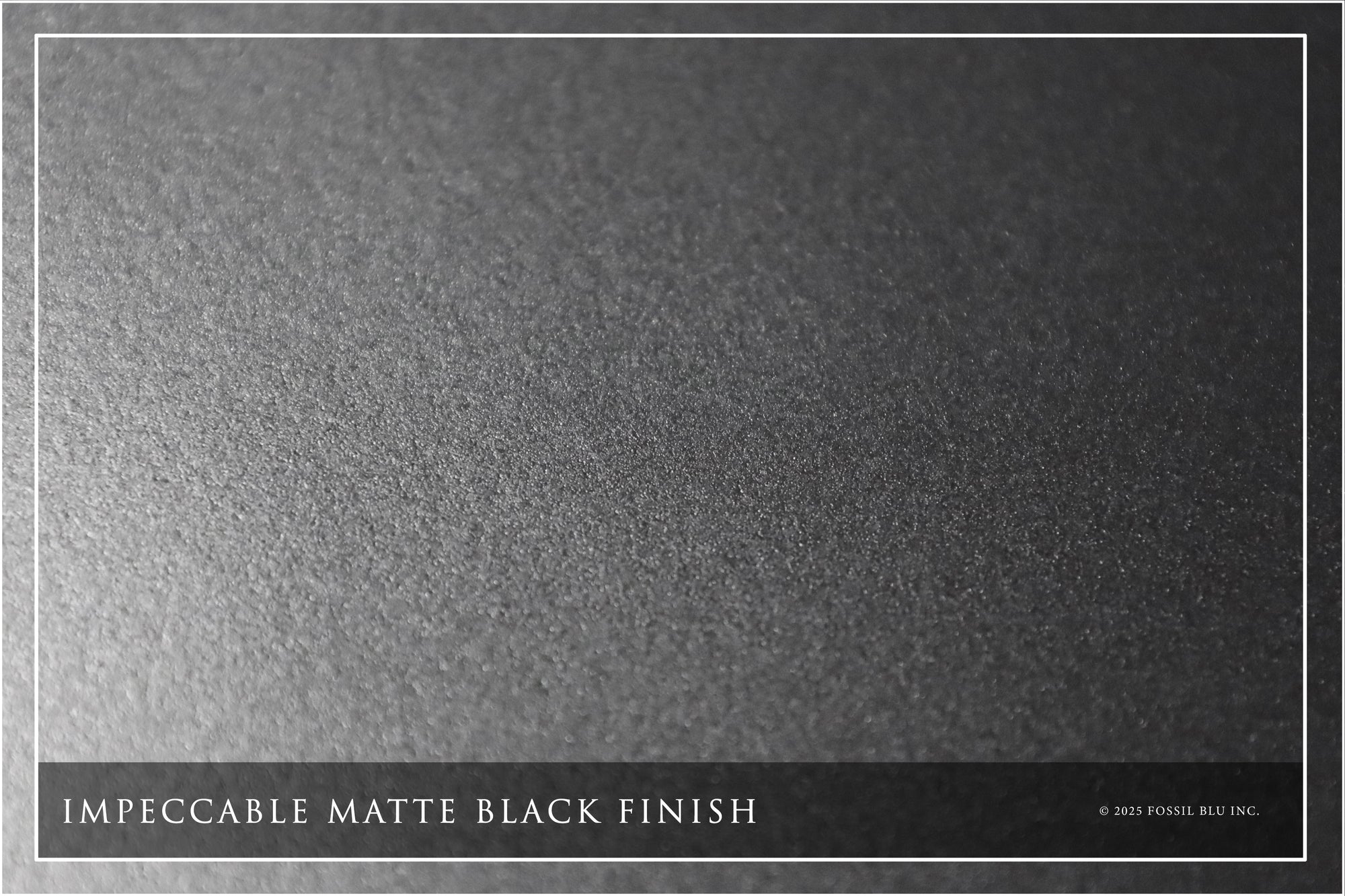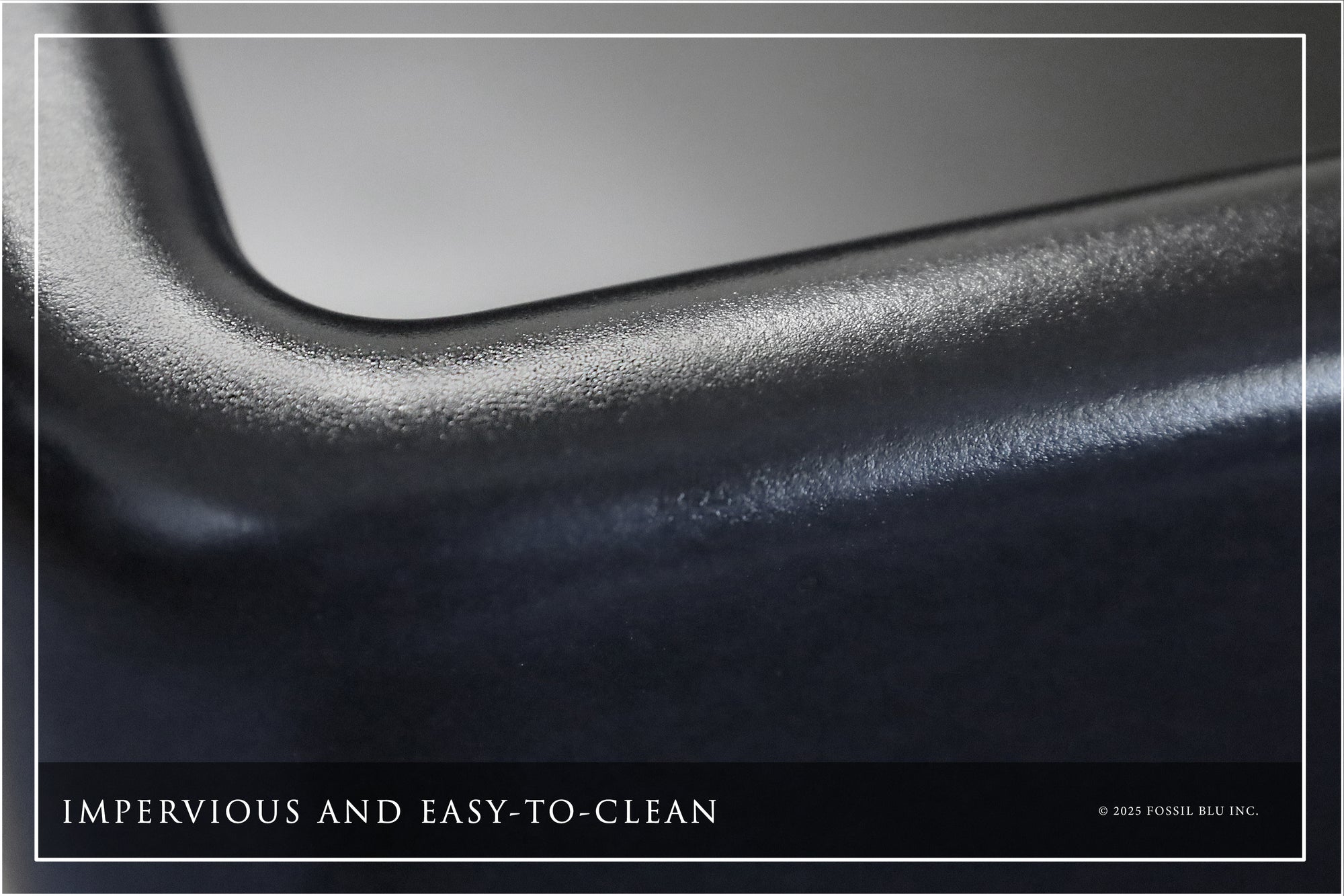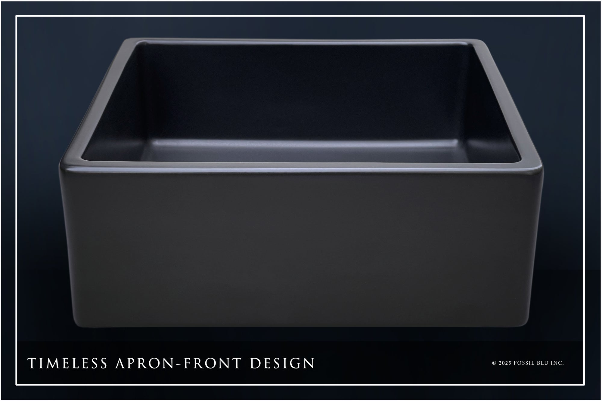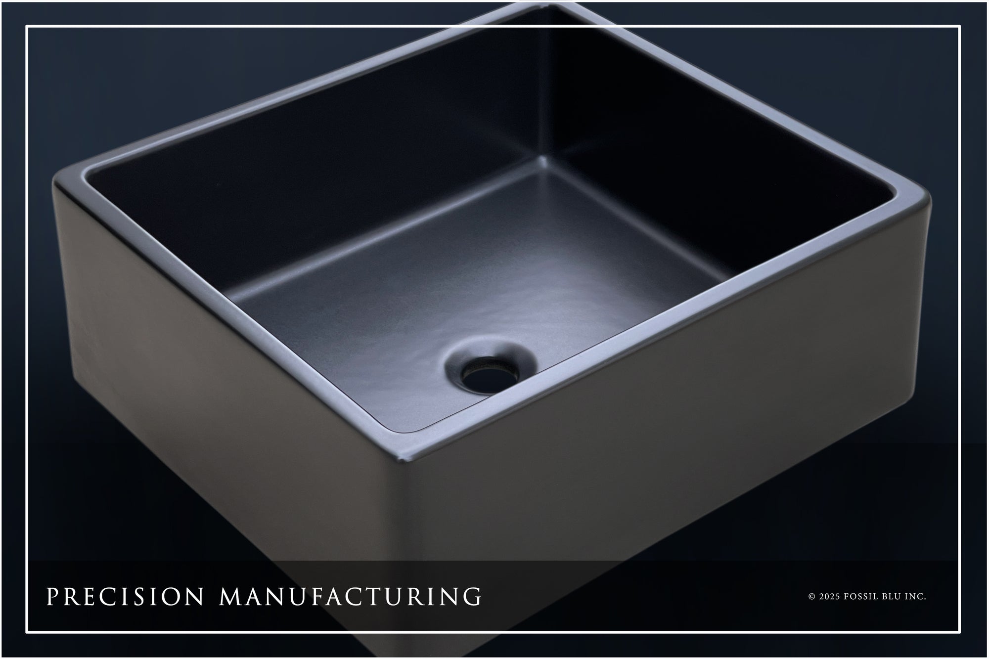 This sink features Fossil Blu’s legendary silica-based glaze, which is robotically applied, allowing for up to twice the glaze thickness compared to hand-sprayed glazing techniques. Fired (kilned) at over 2200-degrees Fahrenheit, the glaze fuses with the fireclay substrate to create a permanent enamel (Learn more about glaze fusing above). This low-gloss (between eggshell & matte) enamel has a very high hardness rating, which means it is non-porous and nearly indestructible. Standard household cleaners and mild abrasives (including bleach and Bar-Keeper’s Friend) are safe to use in moderation. Our Matte Black finish is similar to Black Onyx (sometimes called Gem Tones). RGB value averages are as follows: R: 47, G: 48, B: 50. The consistent RGB values of our finish means the black color has neither a warm nor cool tint. Perfect Black RGB values are each 0 and Perfect White RGB values are each 255. The 47-50 RGB values of our black finish means that it is very dark, but soft in appearance.