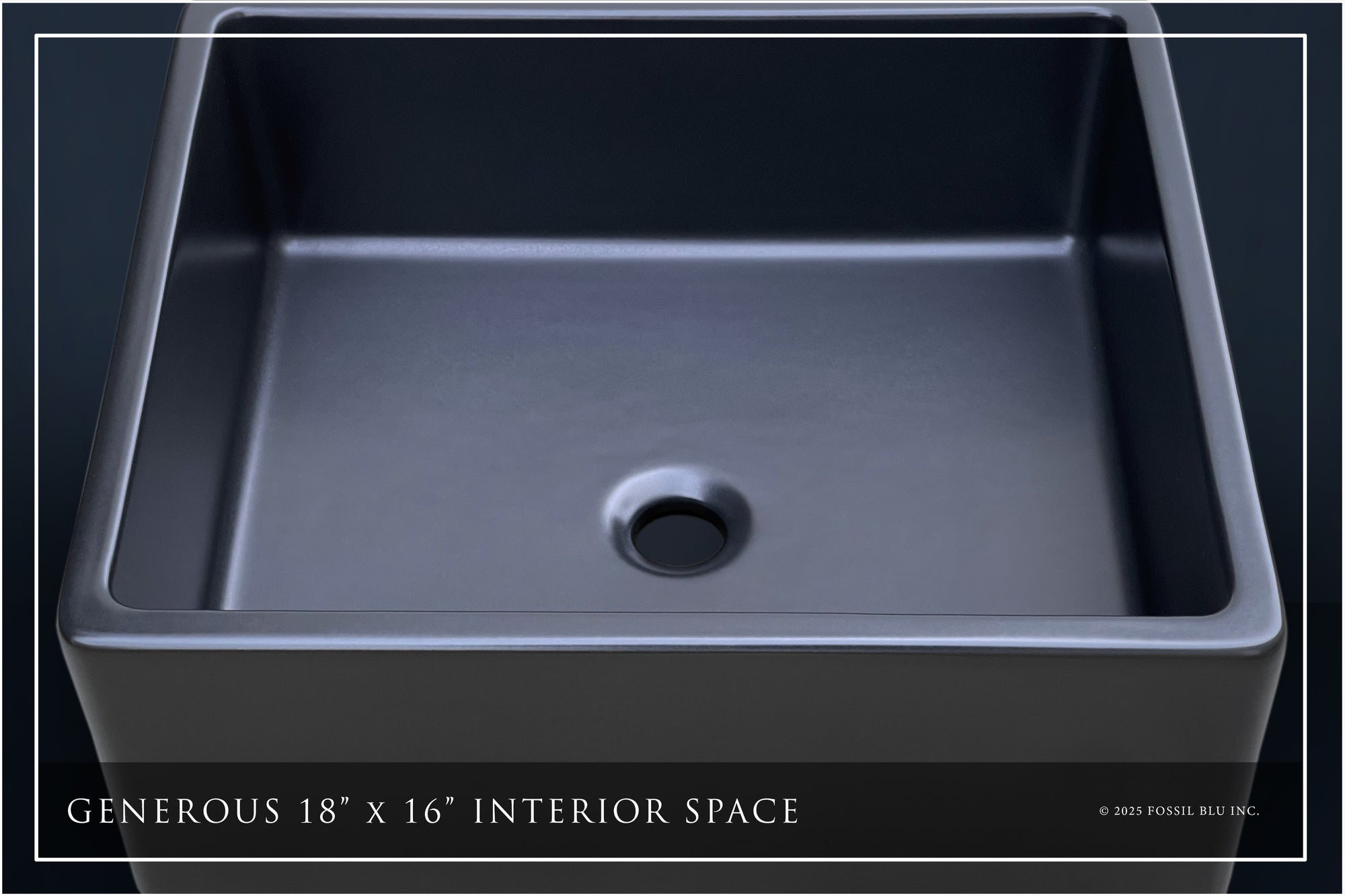With straight sidewalls, tight ½” radius corners, and its apron-front design - which extends past countertop - Fossil Blu bath farmhouse sinks provide for a sink space likely much larger than that which you are accustomed. If you have a busy bathroom, you’ll love the roominess it affords.