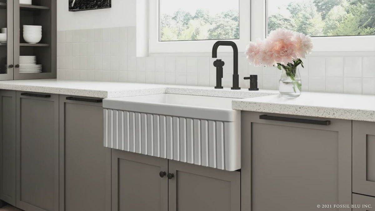 Turn-of-the-century farm sinks nearly always included a design on the front apron. The most common of which was a vertically grooved (fluted) imprint. Today, as the “Modern Farmhouse” trend has taken storm, the majority of new farmhouse sinks sold feature a simple, flat-front, modern apron. However, for those seeking something more, Fossil Blu’s 1.5” beaded shaker style of this fluted-front sink offers a blend of antique styling with a contemporary appeal. The design is crisp, yet features soft edges and a supple appearance to the front, characteristic of the natural fireclay material underneath. At 1-1/8” thickness, the apron presents as a bold, sophisticated sink and, much like shaker cabinet fronts, is a good fit in a variety of classic stylistic themes. The left and right sides of the sink are fully finished, allowing for any install depth. We generally recommend 1-1/2” to 2” of the sink to be exposed on the left and right sides.