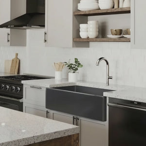 Fossil Blu fireclay sinks are designed with tighter corners and straighter sidewalls for a definitively up-to-date appearance. Combine this with luxurious accessories and a bold rectangular front apron, and your sink becomes the centerpiece of your remodeled kitchen.