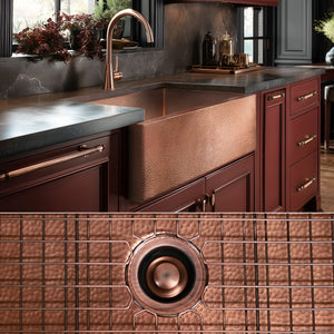 No need to hunt for matching accessories. Included with each sink is a copper-plated sink bottom grid, and a copper-plated disposal flange (copper-plated drain/strainer available on request)