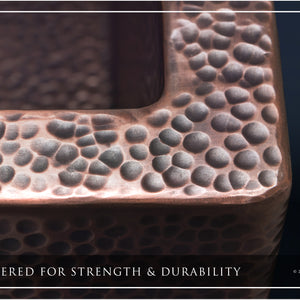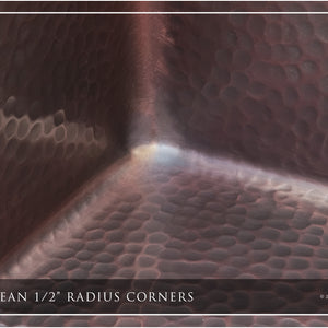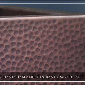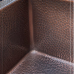 This sink features a mottled finish, characteristic of the natural oxidation, or patina, of copper. Our copper sinks start as raw (semi-shiny) copper, and remain as such throughout manufacturing and hammering. Upon completion of production, we soak each sink in a non-toxic solution similar to household vinegar, which once removed and exposed to oxygen in the air, rapidly oxidizes the metal. At the correct time interval, we apply a torch to the metal to quickly dry the sink and neutralize the process. The dark umber-colored patina has been formed. Next, using a buffing machine with a mild scouring pad, we lightly remove some of the patina from the ridges of the hammer marks, while the valleys retain nearly all of the dark umber hues. Last, we apply non-toxic carnauba wax to seal the copper and patina.
