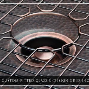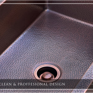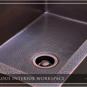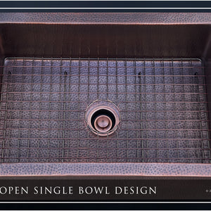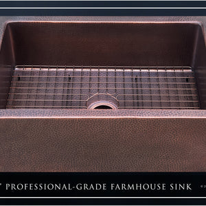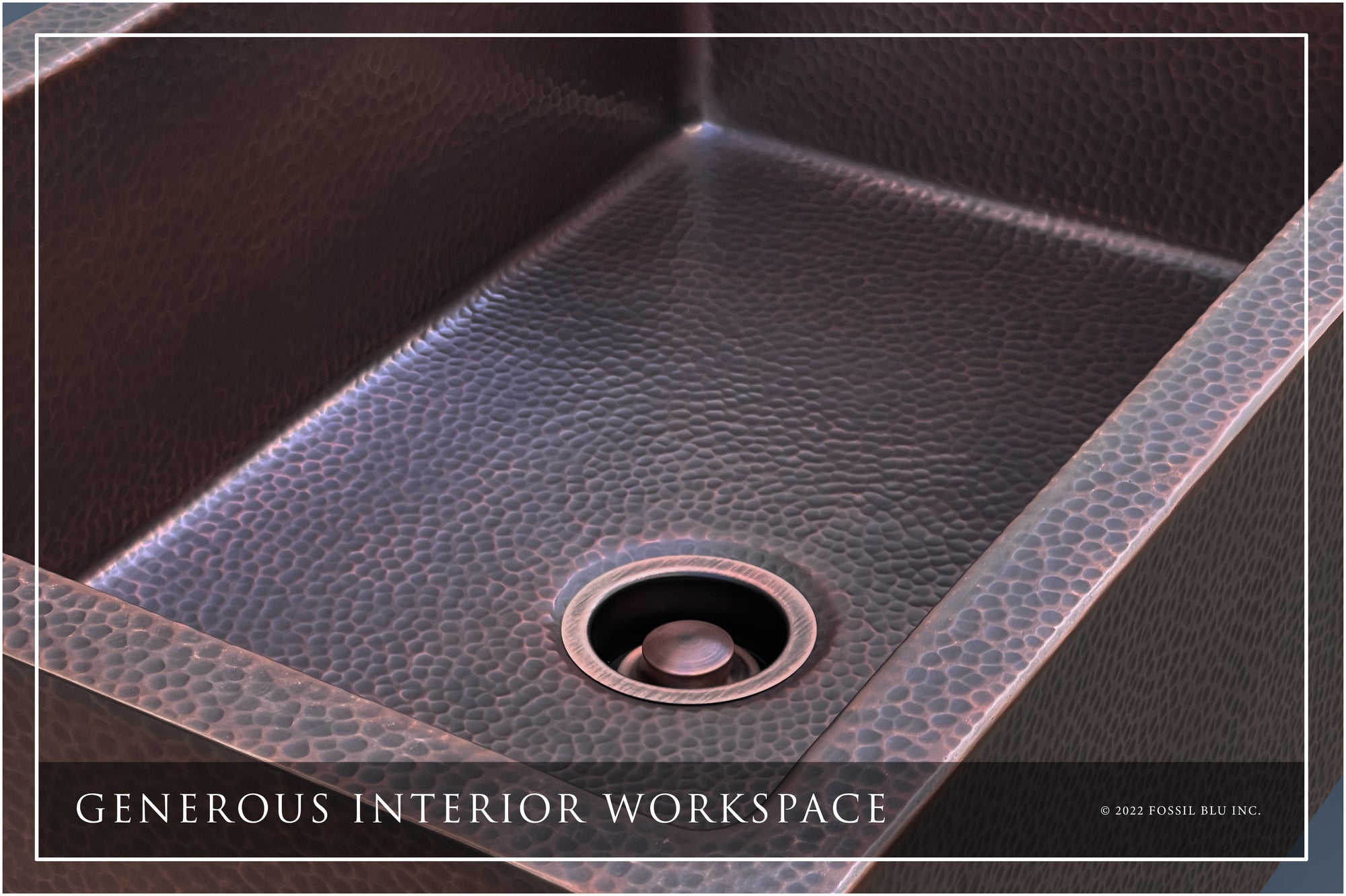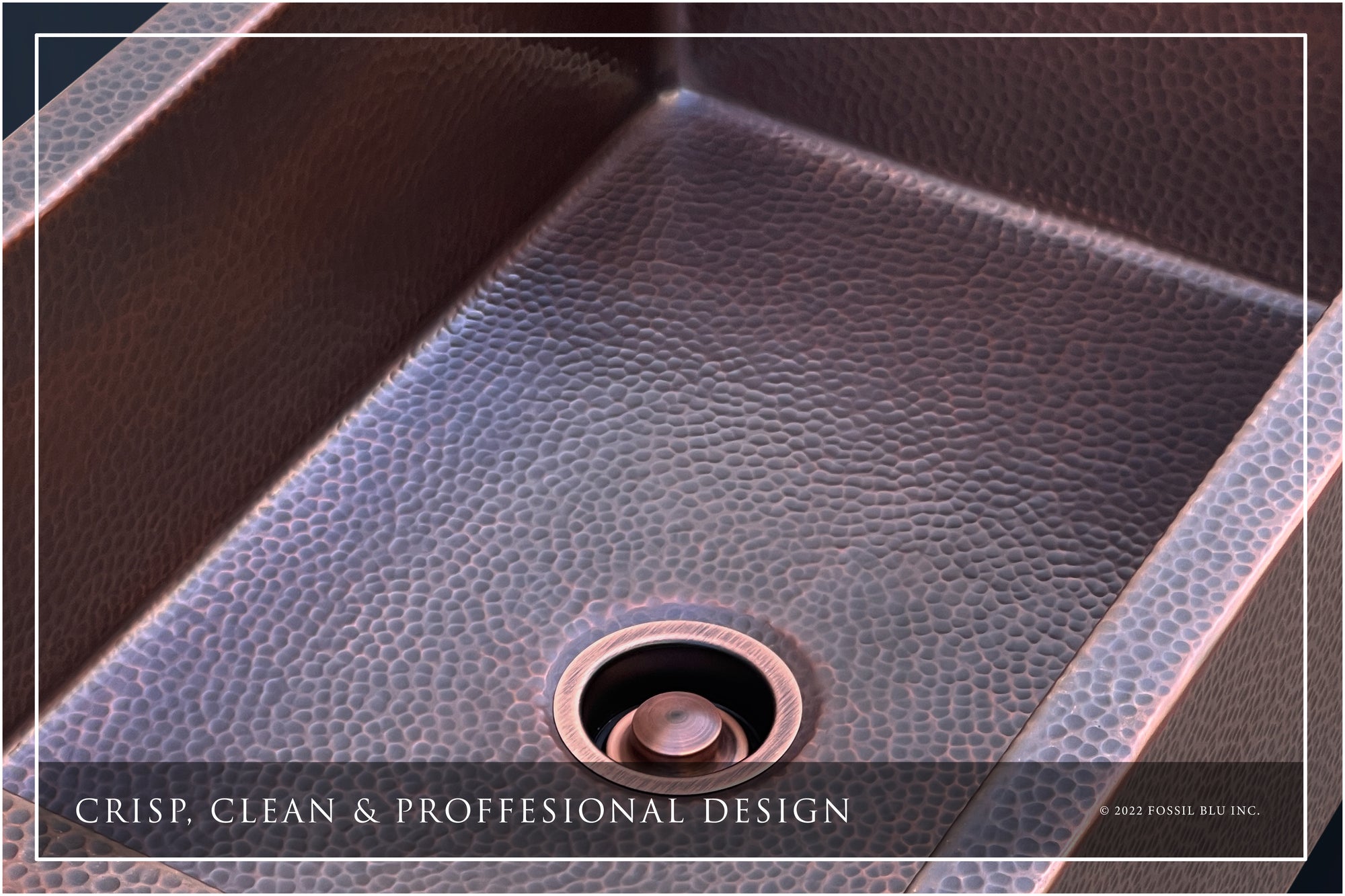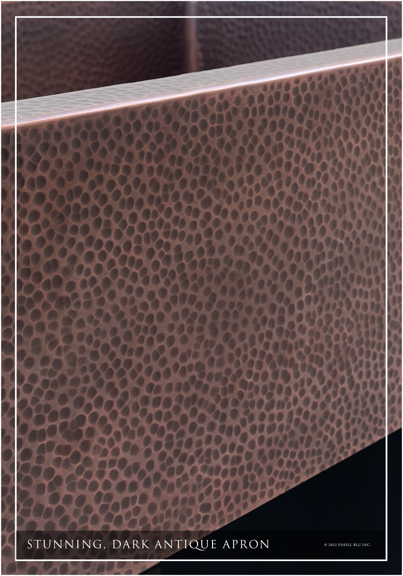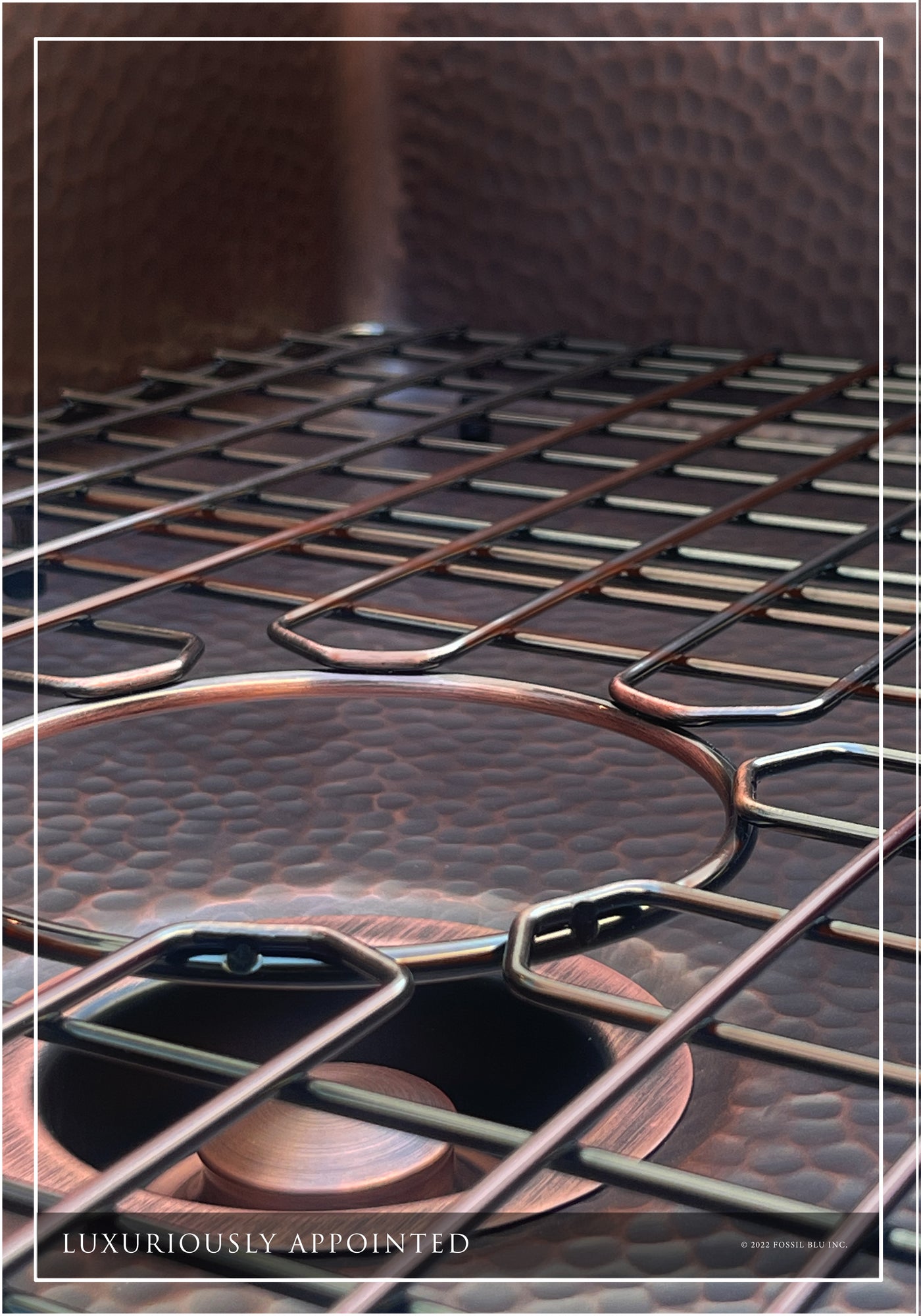 Luxury 30 inch Copper Farmhouse Kitchen Sink, Heavy 12-Gauge Copper, Hammered, Dark Antique Finish, Single Bowl, Flat Front, includes Grid. Fossil Blu copper sinks are DISPOSAL READY with included copper-plated 304 stainless disposal flange and stopper. Also included with each sink is a CUSTOM-FITTED copper-plated 304 stainless basin rack (sink grid) capable of supporting up to 200 LBS of dishes.