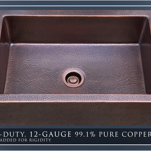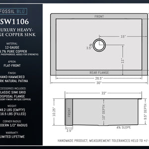 FSW1106 LUXURY 30-INCH HEAVY 12-GAUGE DARK PATINA COPPER FARMHOUSE SINK, INCLUDES ACCS, FLAT FRONT