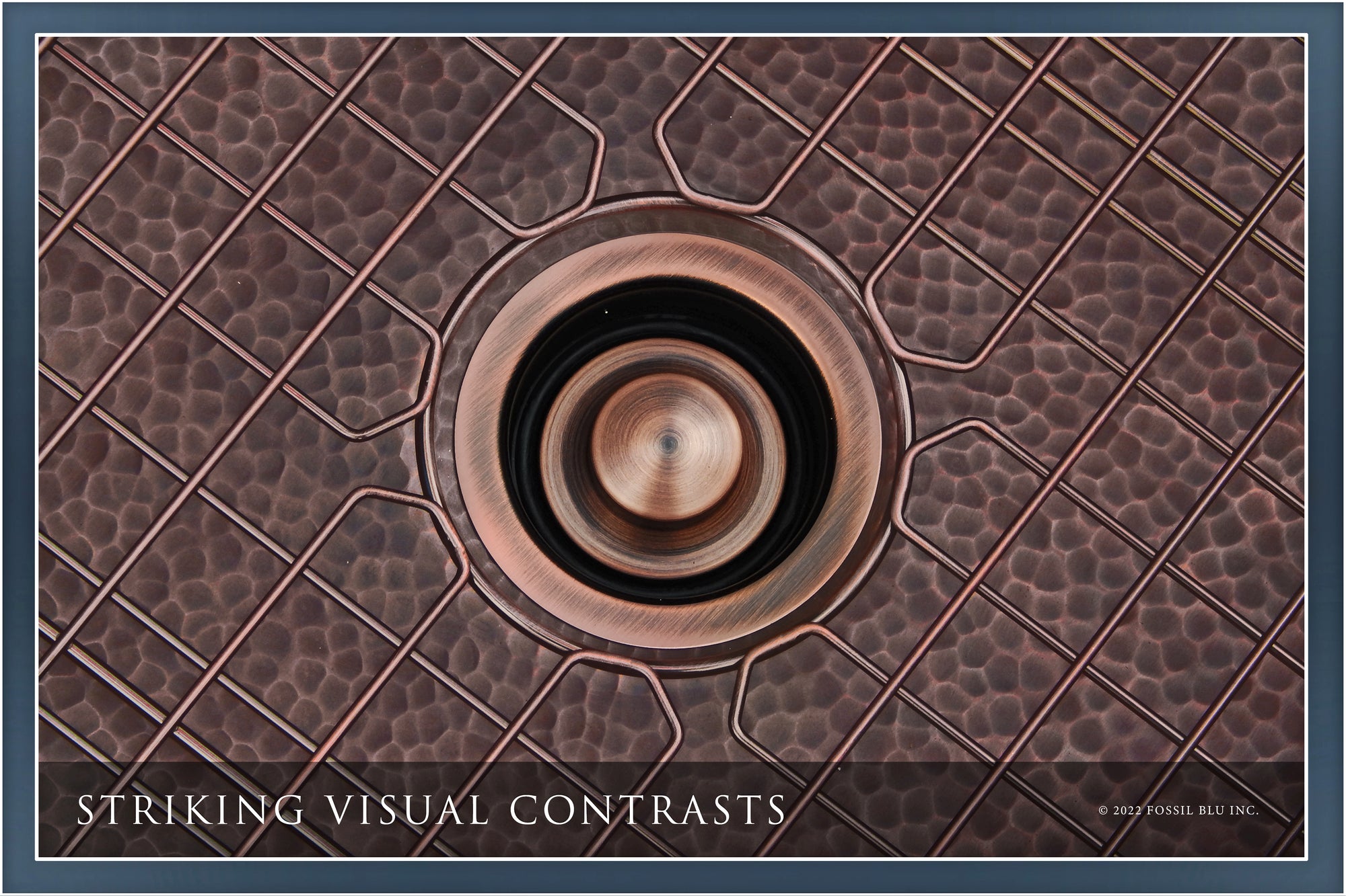 Included with this sink are two accessories: One (1) custom-fitted sink grid, and one (1) garbage-disposal flange. For material strength, these accessories are made from 304 stainless steel, and finished in Antique Copper. To achieve this finish, we first plate the stainless steel with copper before then applying a veil of black powder coating. After light brushing, the copper finish displays an antiqued look, which leans more toward dark tones than brighter copper tones. The darker overall appearance is done so intentionally to be neutral against the tones of the sink. This, along with the neutral appearance of our checkerboard grid, allow the sink to remain the focus, not the accessories. All Fossil Blu sink accessories carry a limited one-year warranty.