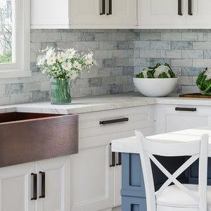 Our most popular choice for the sink apron, Fossil Blu’s flat-front copper farmhouse sinks provide a clean and classic look to updated kitchens. The large, rectangular shape of the apron allows the hammering and finish of the copper sink to be the highlight, not the shape itself. The quality of the sink comes through at its apron - both in its luxurious finish and with its blunt edges – showing its 12-gauge material thickness. This material quality also provides peace of mind. As the most-exposed part of the sink, the apron needs to be able to withstand bumps and bruises. At 1-3/4” wide and 12-gauge thick, this apron is incredibly strong, making it a bold (and wise) addition to your kitchen.