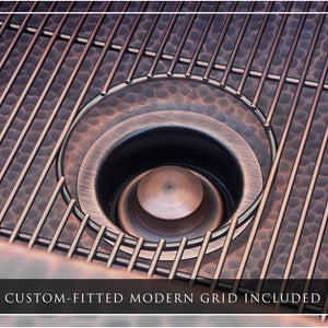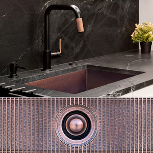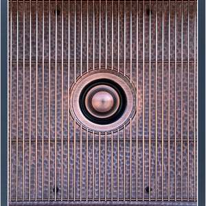 Included with this sink are two accessories: One (1) custom-fitted sink grid, and one (1) garbage-disposal flange. For material strength, these accessories are made from 304 stainless steel, and finished in Antique Copper. To achieve this finish, we first plate the stainless steel with copper before then applying a veil of black powder coating. After light brushing, the copper finish displays an antiqued look, which leans more toward dark tones than brighter copper tones. The darker overall appearance is done so intentionally to be neutral against the tones of the sink. This, along with the neutral appearance of our checkerboard grid, allow the sink to remain the focus, not the accessories. As a plated and powder coated finish (as opposed to painted or vinyl coated), it is incredibly durable.