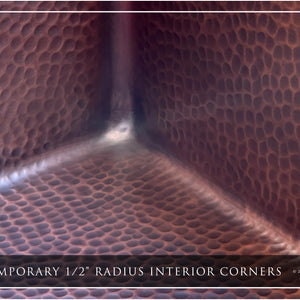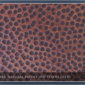 This sink features a mottled finish, characteristic of the natural oxidation, or patina, of copper. Our copper sinks start as raw (semi-shiny) copper and remain as such throughout manufacturing and hammering. Upon completion of production, we soak each sink in a non-toxic solution similar to household vinegar, which once removed and exposed to oxygen in the air, rapidly oxidizes the metal. At the correct time interval, we apply a torch to the metal to quickly dry the sink and neutralize the process. The umber-colored patina has been formed. Next, using a buffing machine with a mild scouring pad, we remove most of the patina from the ridges of the hammer marks, while the valleys retain most of the umber hues. Last, we apply non-toxic carnauba wax to seal the copper and patina.