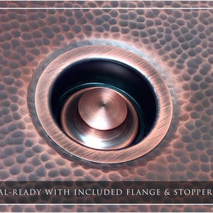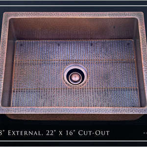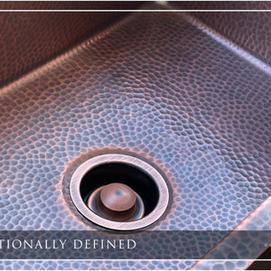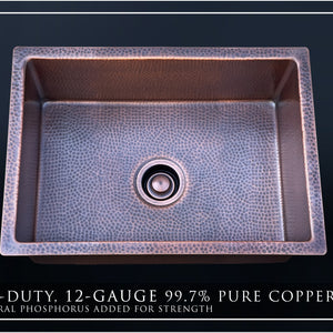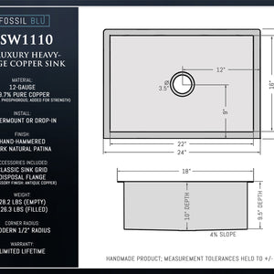 Luxury 24-Inch Copper Undermount Kitchen Sink, Heavy 12-Gauge Copper, Hammered, Dark Antique Finish, Single Bowl. Fossil Blu copper sinks are DISPOSAL READY with included copper-plated 304 stainless disposal flange and stopper. Also included with each sink is a CUSTOM-FITTED copper-plated 304 stainless basin rack (sink grid) capable of supporting up to 200 LBS of dishes.