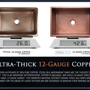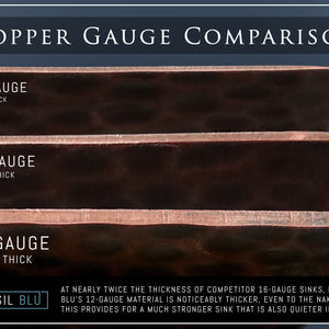 Consider the thickness differences between a dime, a penny, and a nickel. This is roughly the difference between 16-gauge (a dime), 14-gauge (a penny), and 12-gauge (a nickel). With 50-pounds of pure copper going into each of our sinks, Fossil Blu's 12-Gauge Copper sinks are built tough and backed by a limited lifetime warranty.