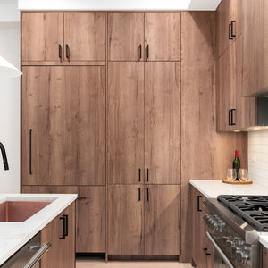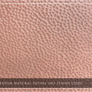 This sink features a mottled finish, characteristic of the natural oxidation, or patina, of copper. Our copper sinks start as raw (semi-shiny) copper, and remain as such throughout manufacturing and hammering. Upon completion of production, we soak each sink in a non-toxic solution similar to household vinegar, which once removed and exposed to oxygen in the air, rapidly oxidizes the metal. At the correct time interval, we apply a torch to the metal to quickly dry the sink and neutralize the process. The umber-colored patina has been formed. Next, using a buffing machine with a mild scouring pad, we remove most of the patina from the ridges of the hammer marks, while the valleys retain most of the umber hues. Last, we apply non-toxic carnauba wax to seal the copper and patina.