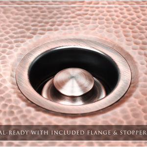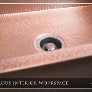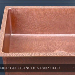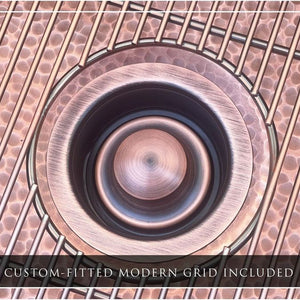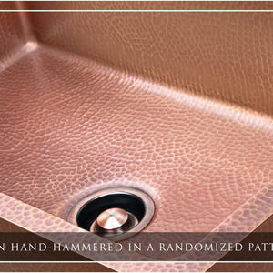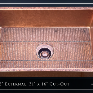 Luxury 33-Inch Copper Undermount Kitchen Sink, Heavy 12-Gauge Copper, Hammered, Medium Antique Finish, Single Bowl. Fossil Blu copper sinks are DISPOSAL READY with included copper-plated 304 stainless disposal flange and stopper. Also included with each sink is a CUSTOM-FITTED copper-plated 304 stainless basin rack (sink grid) capable of supporting up to 200 LBS of dishes.