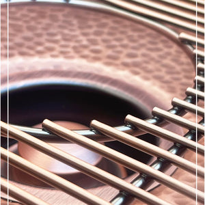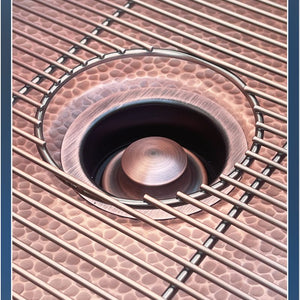 Included with this sink are two accessories: One (1) custom-fitted sink grid, and one (1) garbage-disposal flange. For material strength, these accessories are made from 304 stainless steel, and finished in Antique Copper. To achieve this finish, we first plate the stainless steel with copper before then applying a veil of black powder coating. After light brushing, the copper finish displays an antiqued look, which leans more toward dark tones than brighter copper tones. The darker overall appearance is done so intentionally to be neutral against the tones of the sink. This, along with the neutral appearance of our checkerboard grid, allow the sink to remain the focus, not the accessories. As a plated and powder coated finish (as opposed to painted or vinyl coated), it is incredibly durable.