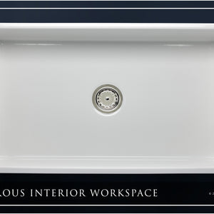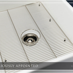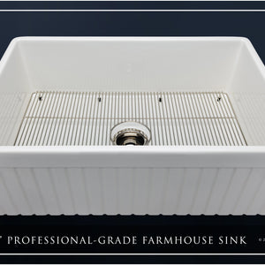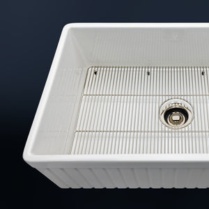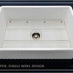Luxury 33" x 20" compression-molded SOLID fireclay farmhouse kitchen sink. Single bowl, modern design with 1/2" radius interior corners, straight sidewalls, fluted-front apron, 7/8" material thickness, and glossy glaze. Elegant polished nickel "linear" (pattern) sink grid, basket strainer-drain, and disposal flange included