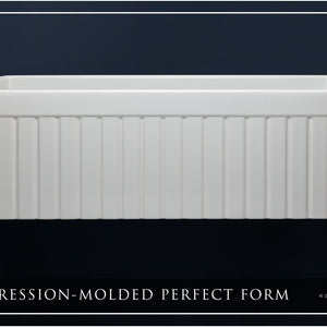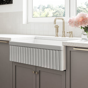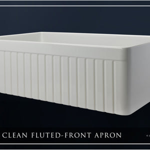 Turn-of-the-century farm sinks nearly always included a design on the front apron. The most common of which was a vertically grooved (fluted) imprint. Today, as the “Modern Farmhouse” trend has taken storm, the majority of new farmhouse sinks sold feature a simple, flat-front, modern apron. However, for those seeking something more, Fossil Blu’s 1.5” beaded shaker style of this fluted-front sink offers a blend of antique styling with a contemporary appeal. The design is crisp, yet features soft edges and a supple appearance to the front, characteristic of the natural fireclay material underneath. At 1-1/8” thickness, the apron presents as a bold, sophisticated sink and, much like shaker cabinet fronts, is a good fit in a variety of classic stylistic themes. The left and right sides of the sink are fully finished, allowing for any install depth. We generally recommend 1-1/2” to 2” of the sink to be exposed on the left and right sides.