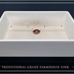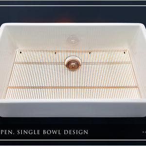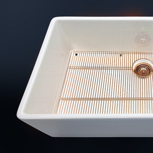 Luxury 36" x 20" compression-molded SOLID fireclay farmhouse kitchen sink. Single bowl, modern design with 1/2" radius interior corners, straight sidewalls, flat front apron, 7/8" material thickness, and glossy glaze. Elegant polished rose gold "linear" (pattern) sink grid, basket strainer-drain, and disposal flange included