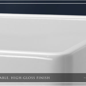 This sink features Fossil Blu’s legendary silica-based glaze, which is robotically applied, allowing for up to twice the glaze thickness compared to hand-sprayed glazing techniques. Fired (kilned) at over 2200-degrees Fahrenheit, the glaze fuses with the fireclay substrate to create a permanent enamel. This high-gloss enamel has a very high hardness rating, which means it is non-porous and nearly indestructible. Standard household cleaners and mild abrasives (including bleach and Bar-Keeper’s Friend) are safe to use in moderation. Our white finish is similar to Appliance White (sometimes called Smoke White). RGB value averages are as follows: R: 235, G: 235, B: 237. The consistent RGB values of our finish means the white color has neither a warm nor cool tint. The high RGB values means the white is near perfect white (RGB each at 255).