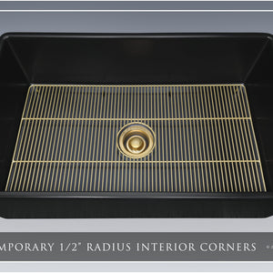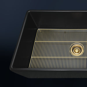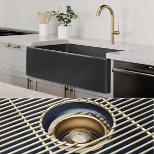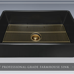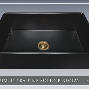 Luxury 33" x 20" compression-molded SOLID fireclay farmhouse kitchen sink in MATTE BLACK. Single bowl, modern design with 1/2" radius interior corners, straight sidewalls, flat front apron, 7/8" material thickness, and matte glaze. Elegant matte gold "linear" (pattern) sink grid, basket strainer-drain, and disposal flange included